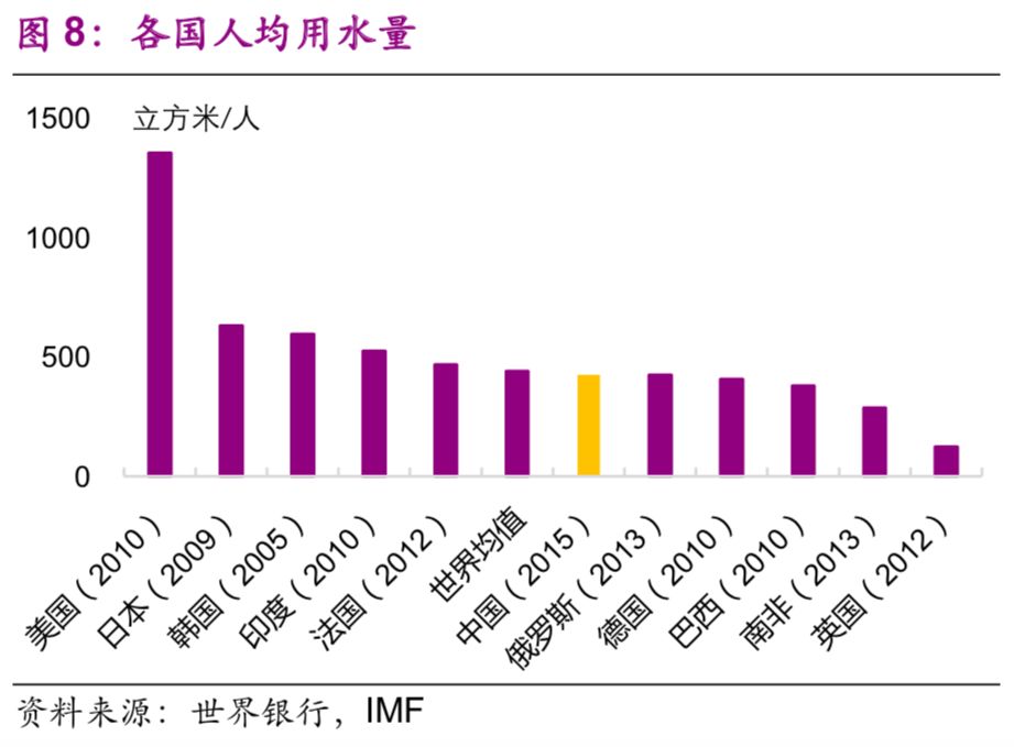 在用電與用水方面,中國的人均水平仍然較低,與人均GDP水平相適應(yīng)。中國人均用電量和人均用水量分別為3927千瓦時(shí)/人(2014年數(shù)據(jù))、425立方米/人(2015年數(shù)據(jù)),與世界平均水平(3966千瓦時(shí)/人、442立方米/人)大致相近,也與中國的人均GDP水平相適應(yīng),是美國(12984千瓦時(shí)/人、1357立方米/人)的30.2%、31.4%(圖7、8)。