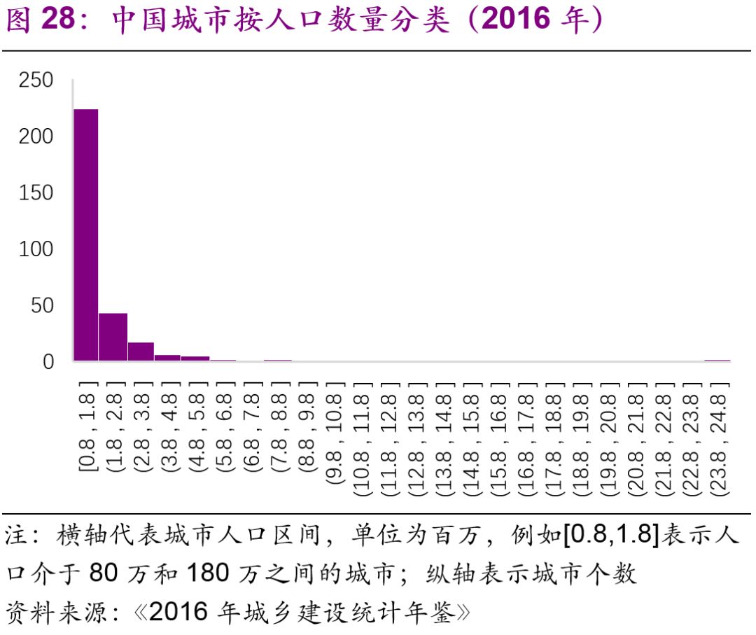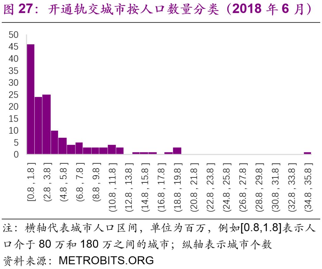 擬建地鐵、輕軌線路初期客運(yùn)強(qiáng)度分別不低于每日每公里0.7萬人次、0.4萬人次,遠(yuǎn)期客流規(guī)模分別達(dá)到單向高峰小時(shí)3萬人次以上、1萬人次以上。但是同時(shí)也強(qiáng)調(diào)了:“以上申報(bào)條件將根據(jù)經(jīng)濟(jì)社會發(fā)展情況按程序適時(shí)調(diào)整?!?016年,中國城市中市區(qū)常住人口在150萬以上的城市共有111個(gè),對比目前已經(jīng)開通軌道交通的城市數(shù)量(34個(gè)),仍有一定的發(fā)展空間。而從國際上看,建設(shè)軌道交通的城市人口的起點(diǎn)[19]大約為100萬(圖27),如果長期內(nèi)中國將建設(shè)軌道交通的人口標(biāo)準(zhǔn)下調(diào)至100萬,那么將有225個(gè)城市符合標(biāo)準(zhǔn)(圖28)。