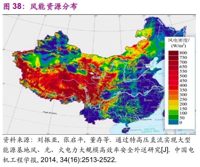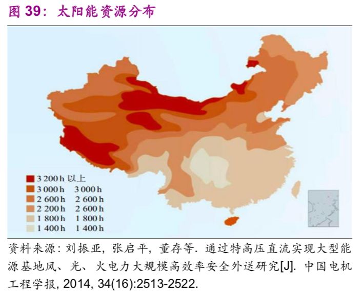 中國能源資源在地區(qū)之間的不平衡分布帶來了跨地區(qū)之間的能源輸送需求,例如“西電東送”“西氣東輸”。以水力資源為例,中國西部12個(gè)省的水力資源約占全國總量的81.46%,特別是西南地區(qū)的云、貴、川、渝、藏5個(gè)省占全國總量的66.70%。風(fēng)能、太陽能同樣呈現(xiàn)西部多于東部的現(xiàn)象(圖38、39)。