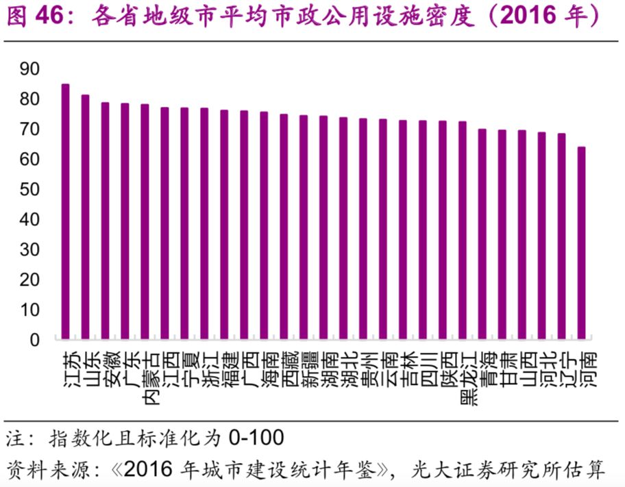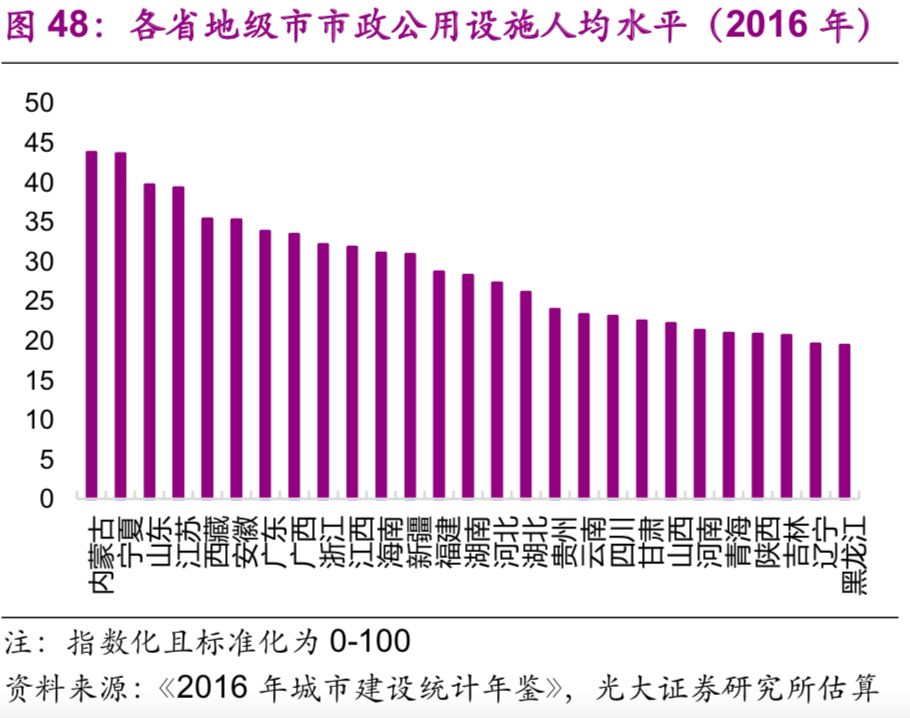 城市市政公用設(shè)施投資結(jié)構(gòu)不斷變化。隨著中國城鎮(zhèn)化的不斷推進(jìn),2016年投資額達(dá)1.7萬億元的城市市政公用設(shè)施投資結(jié)構(gòu)有了較大變化:1990年占據(jù)較大比重的燃?xì)猓?6%)、供水(20%)隨著滲透率觸及“天花板[26]”后比重下降較快,兩者2016年的比重分別為2%、3%;而更能體現(xiàn)城市功能升級的公共交通、道路橋梁等的比重上升較快,1990年兩者的比重分別為8%、26%,2016年則分別為23%、43%;此外,許多新型的城市市政公用設(shè)施投資開始出現(xiàn),例如地下綜合管廊,2016年占比達(dá)到了1.7%(圖44)。