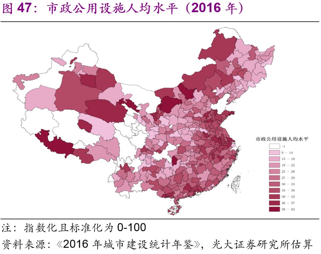 東部和部分西部城市的市政公用設(shè)施水平較高。為了綜合分析各個(gè)城市的市政公用設(shè)施水平,我們使用主成份分析法,選取人均日生活用水量、人均道路面積、人均公園綠地面積,對2016年中國各城市得出了綜合的城市市政公用設(shè)施的總量[27]、密度(圖45-46)和人均水平(圖47-48)進(jìn)行了比較。無論從總量、密度還是人均水平上來看,東部和部分西部城市都比較高,反而是一些中部和東北部城市的城市市政公用設(shè)施水平處于全國比較落后的狀態(tài)。
